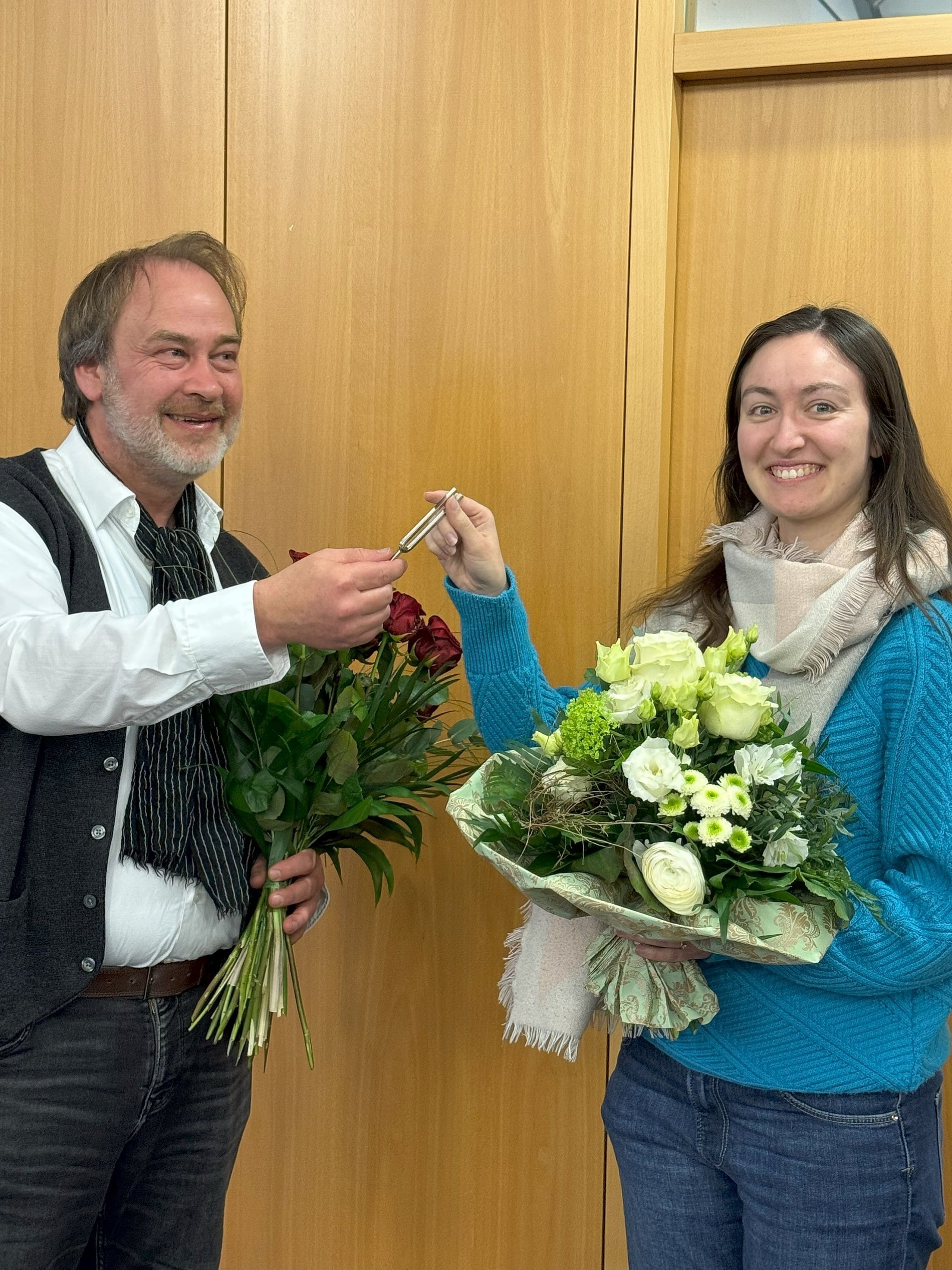 An diesem Abend wurde aber auch die „Stimmgabel“ an die neue Dirigentin des Chores Laura-Maria Püsch weitergegeben. Für den Chor ist sie keine Unbekannte, da sie seit ca. einem Jahr schon jede zweite Woche die Probe von Herrn Schunk übernommen hat. Sie selbst hat Gesangspädagogik und Alte Musik studiert. Ebenso kann sie eine Ausbildung zur Ensemble-Leiterin vorweisen. Den ersten großen „Auftritt“ wird sie an Ostersonntag im feierlichen Hochamt mit dem Chor haben.
