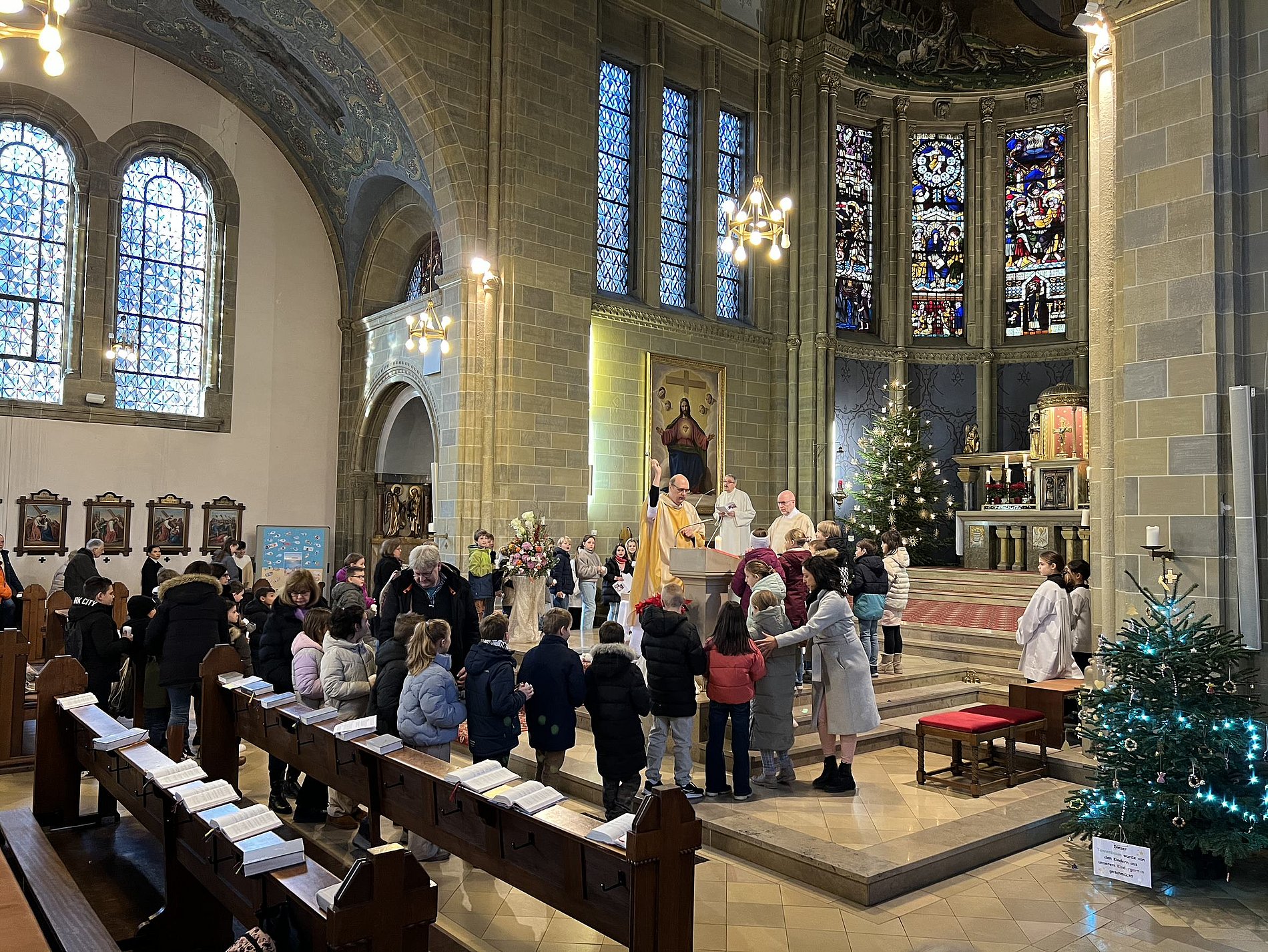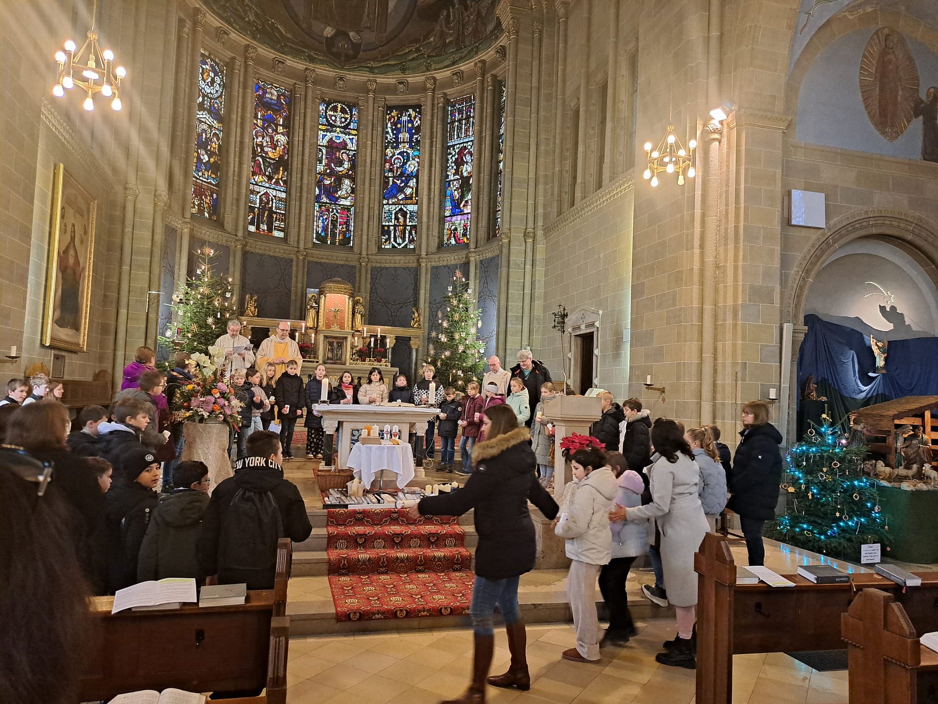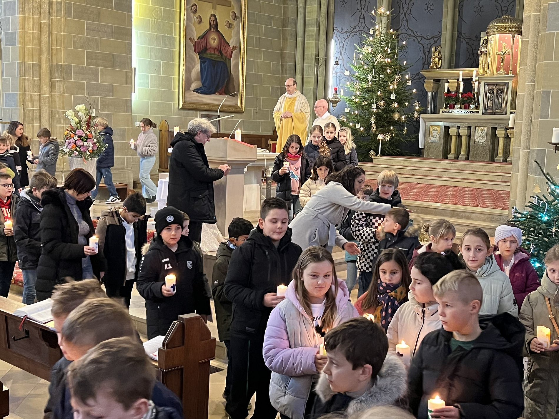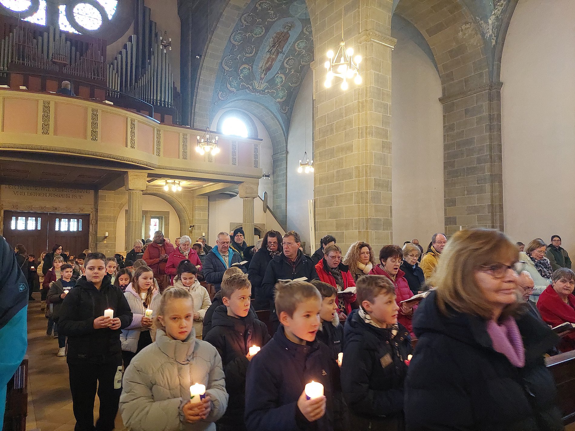 Nach der Stärkung gingen alle in die Kirche, um den Familiengottesdienst an Maria Lichtmess zu feiern, der von den Kommunionkindern mitgestaltet wurde. Im Gottesdienst wurden zunächst die Kerzen geweiht und anschließend zogen alle Kinder in einer Lichterprozession durch die Kirche.