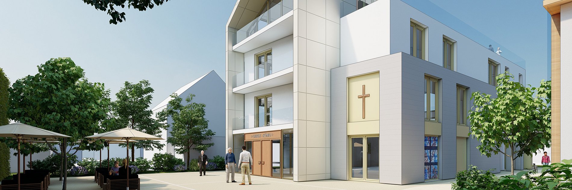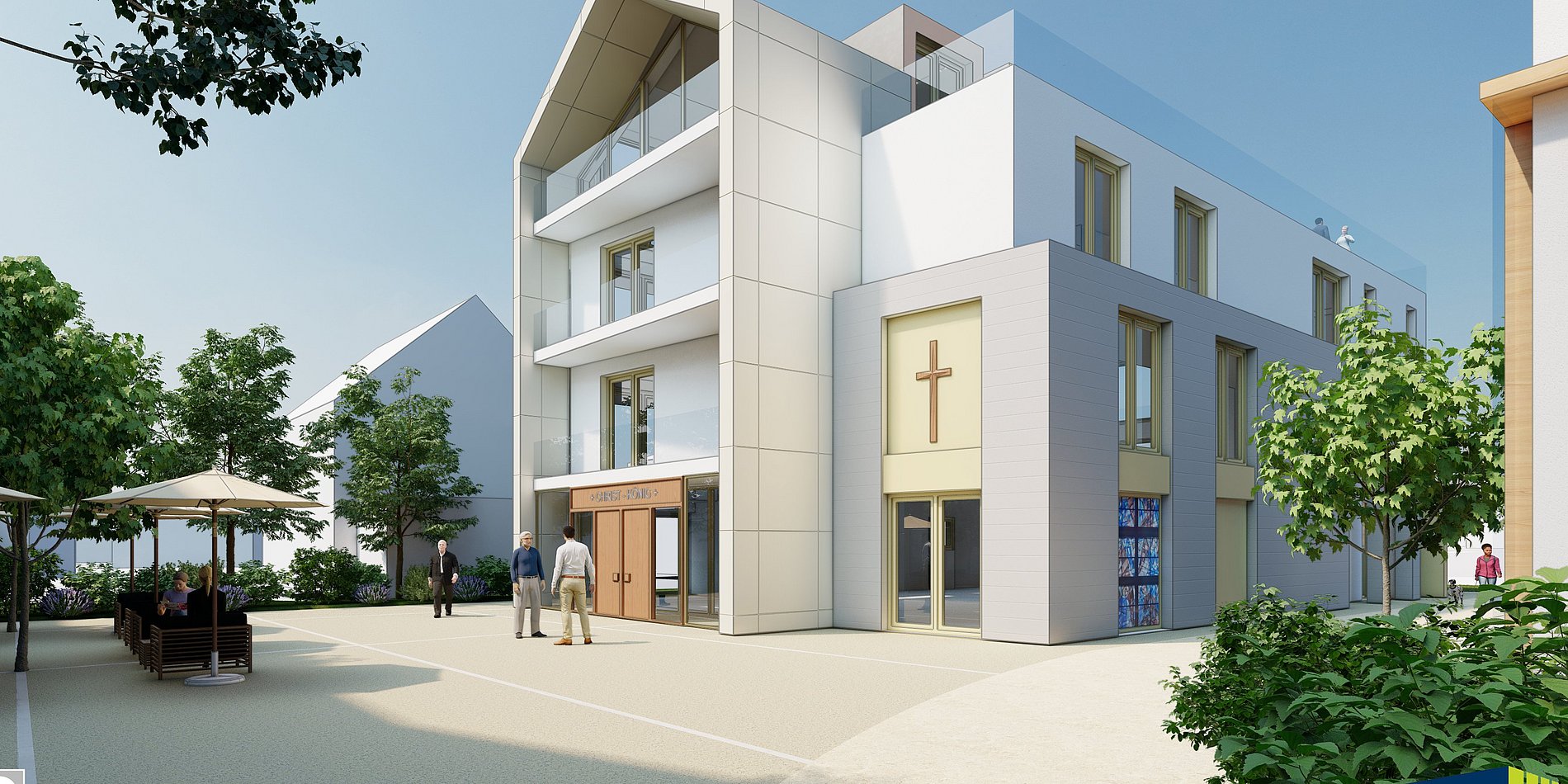 Geplant sind 52 Wohnungen – davon 37 in einer Seniorenresidenz und 15 im freien Wohnungsbau – ergänzt durch Tagespflege, Physiotherapie, ein Café mit Bäckerei, Gewerbefläche sowie gemeinschaftliche Flächen. Herzstück des Quartiers bildet ein zentraler Platz, der die Bewohner mit der Kirchengemeinde und Besuchern zusammenführt. Das neue Gemeindezentrum bietet flexible, barrierefreie Räume für neue pastorale Formate und Angebote sowie Gottesdienste, Begegnungen und Veranstaltungen.