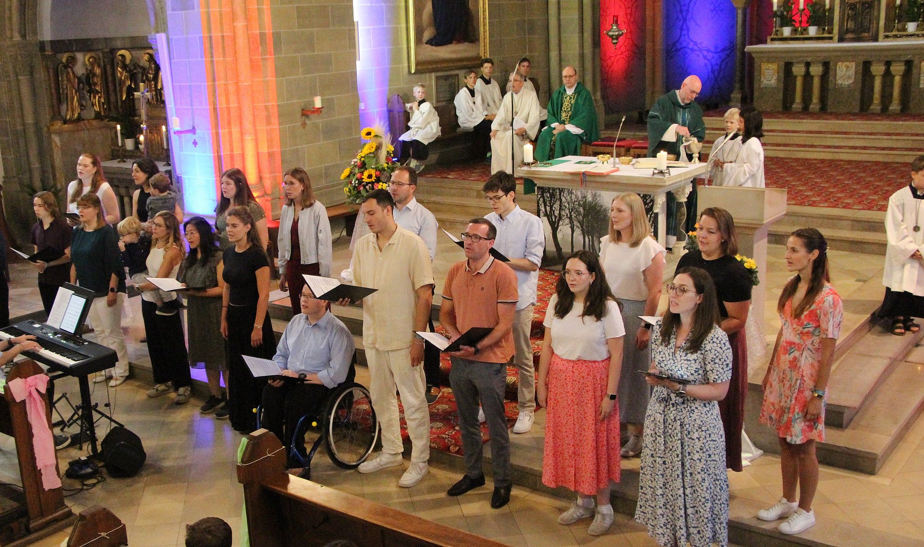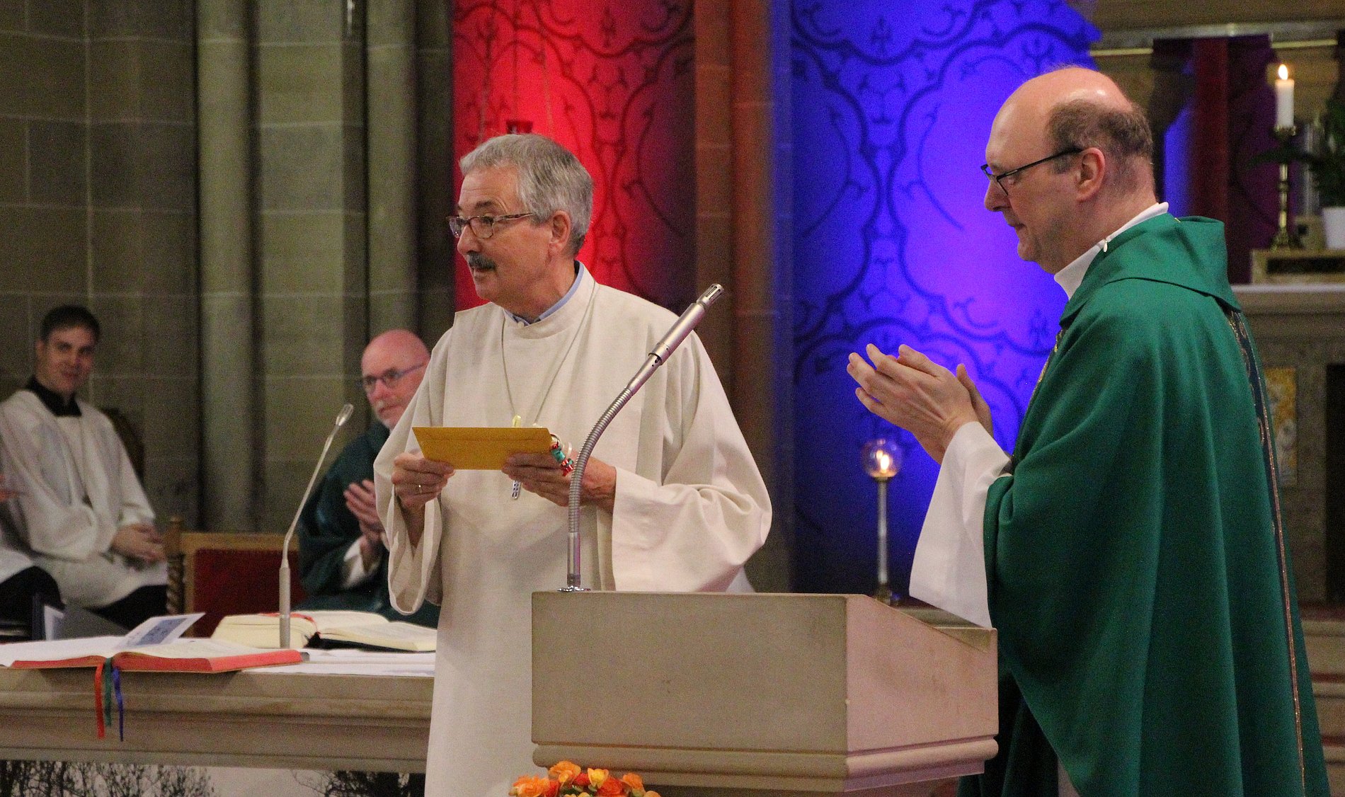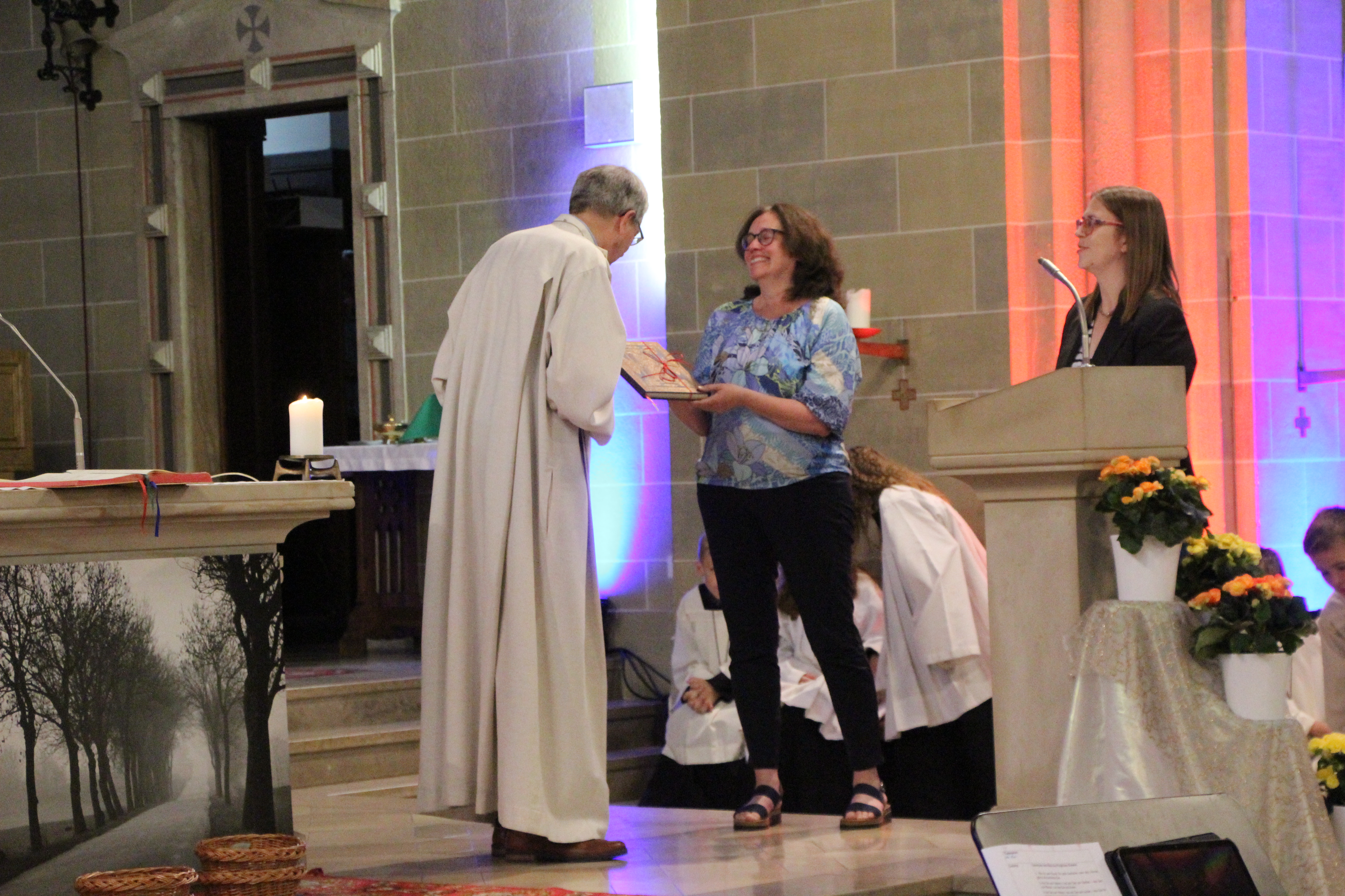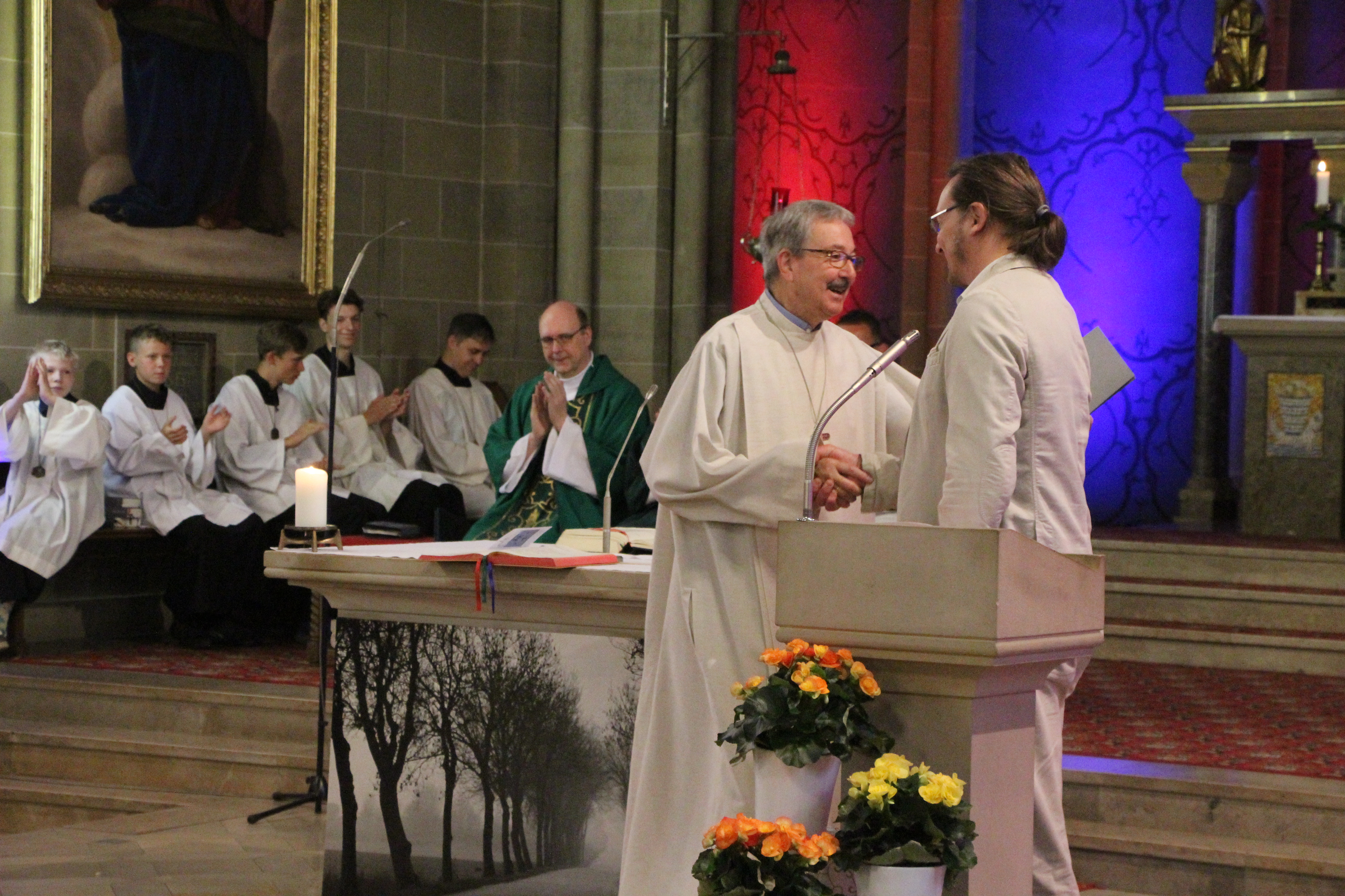 Am Ende des Gottesdienstes bekam Joachim Kahle dann von Elmar Honemann aus dem Bischöflichen Ordinariat offiziell die Urkunde zum Ruhestand überreicht. Dr. Ulrich Göbel, PGR-Vorsitzender und Pfarrer Andreas Klee, wünschten auch ihm auf seinem neuen Weg alles Gute, vor allem aber auch Gesundheit, damit er als Familienmensch noch viele wunderbare Jahre mit seiner Frau, den Kinder und den Enkelkindern verbringen kann. Mit Standing Ovations bedankte sich die Gemeinde St. Martinus bei ihm. Musikalisch untermalt wurde der Gottesdienst auf Wunsch von Joachim Kahle von seiner Band Sol Vivo aus Sulzbach und der Junge Kantorei Bad Soden, die von seinem Schwiegersohn Tobias Landsiedel dirigiert wird.